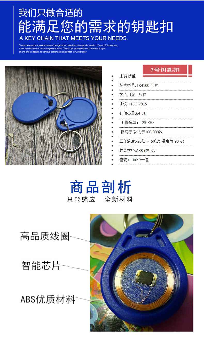 武汉李峰安全技术有限公司3号感应钥匙扣蓝色款空白卡常年有备库存现货,批发供应,量大价优,另外可按需求在钥匙扣表面印刷LOGO和内码等,如需写入数据请在报价前告知相关业务人员。