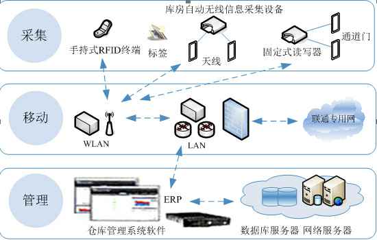 货物分配出库―货物经叉车或传送带运出仓库时,货物的信息会被阅读器快速读取,数据自动从数据库调出,